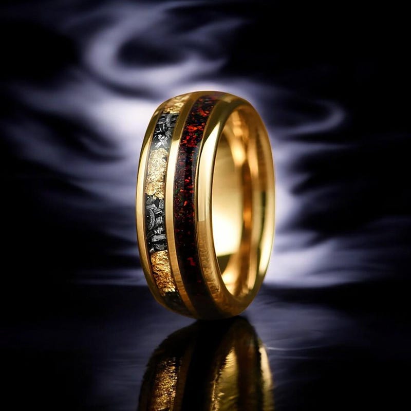 Red Opal ,Meteorite & Gold Leaf Inlay 8MM,6MM Tungsten Carbide Wedding Ring